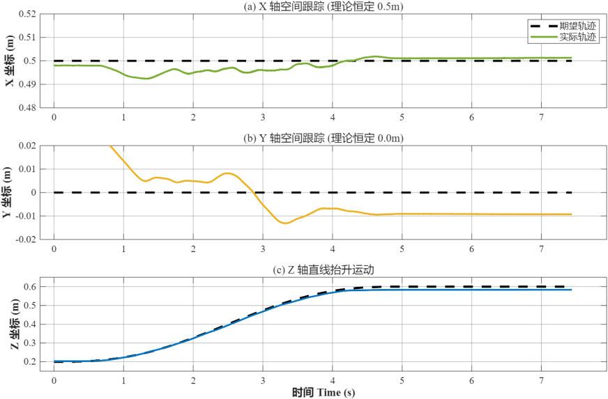 基于 DH 参数的正逆运动学解析解,结合时间序列索引与线性插值,保障了系统底层的绝对实时性。从空间映射数据来看,Z 轴执行大范围运动时,非运动方向(X/Y轴)的交叉耦合微波振荡被有效抑制。
