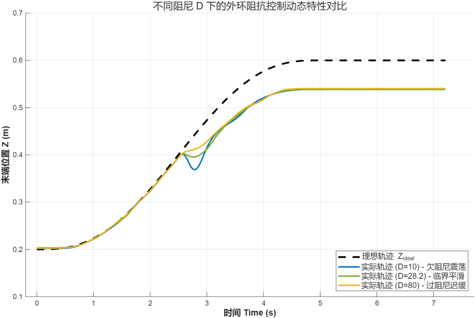 在此基础上,系统部署了经典的二阶导纳控制(Admittance Control)模型,通过建立 惯性 M、阻尼 D 与 刚度 K 的动力学平衡,使系统对外部作用力产生位置退让。通过实机单变量特性分析实验,我将系统精准整定至最优临界阻尼状态,有效消除了欠阻尼参数下易引发的弹簧震荡感。